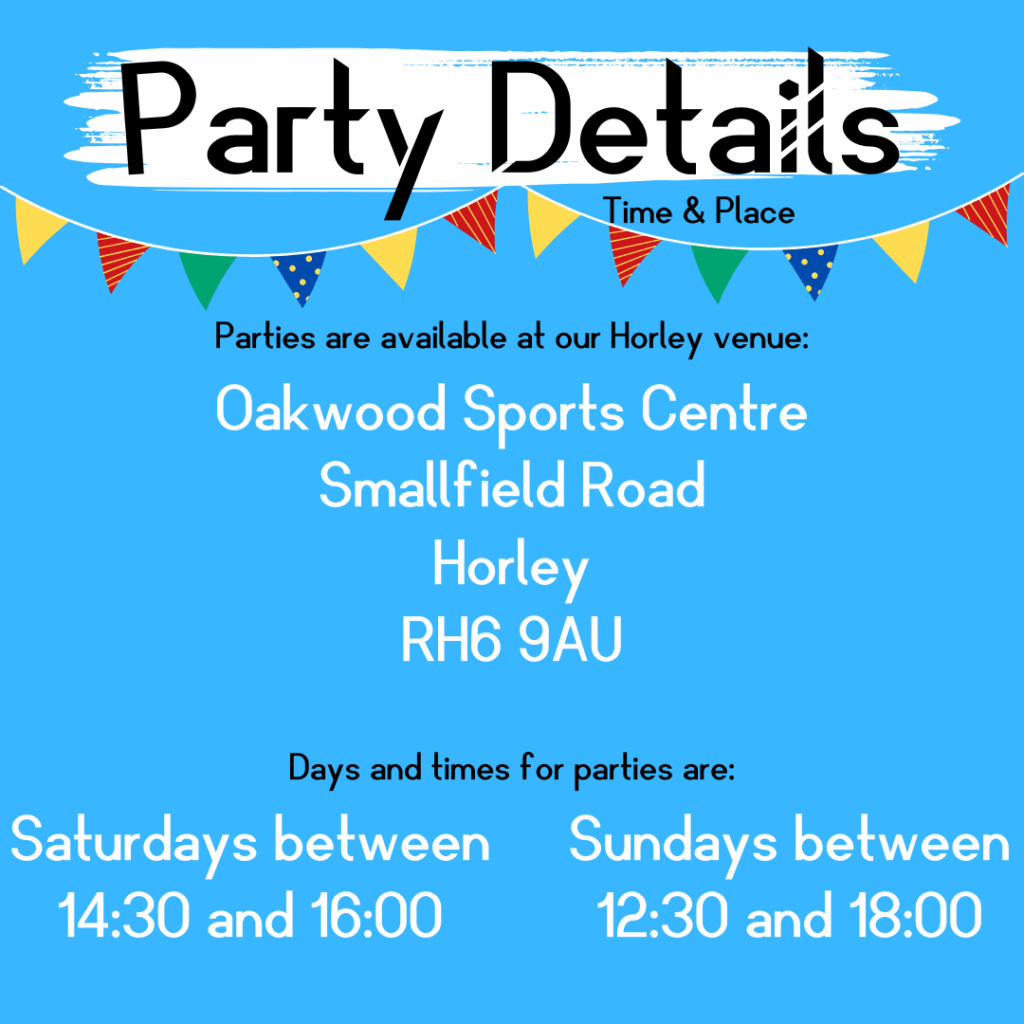 All parties are held at our Horley venue, Oakwood Sports Centre.